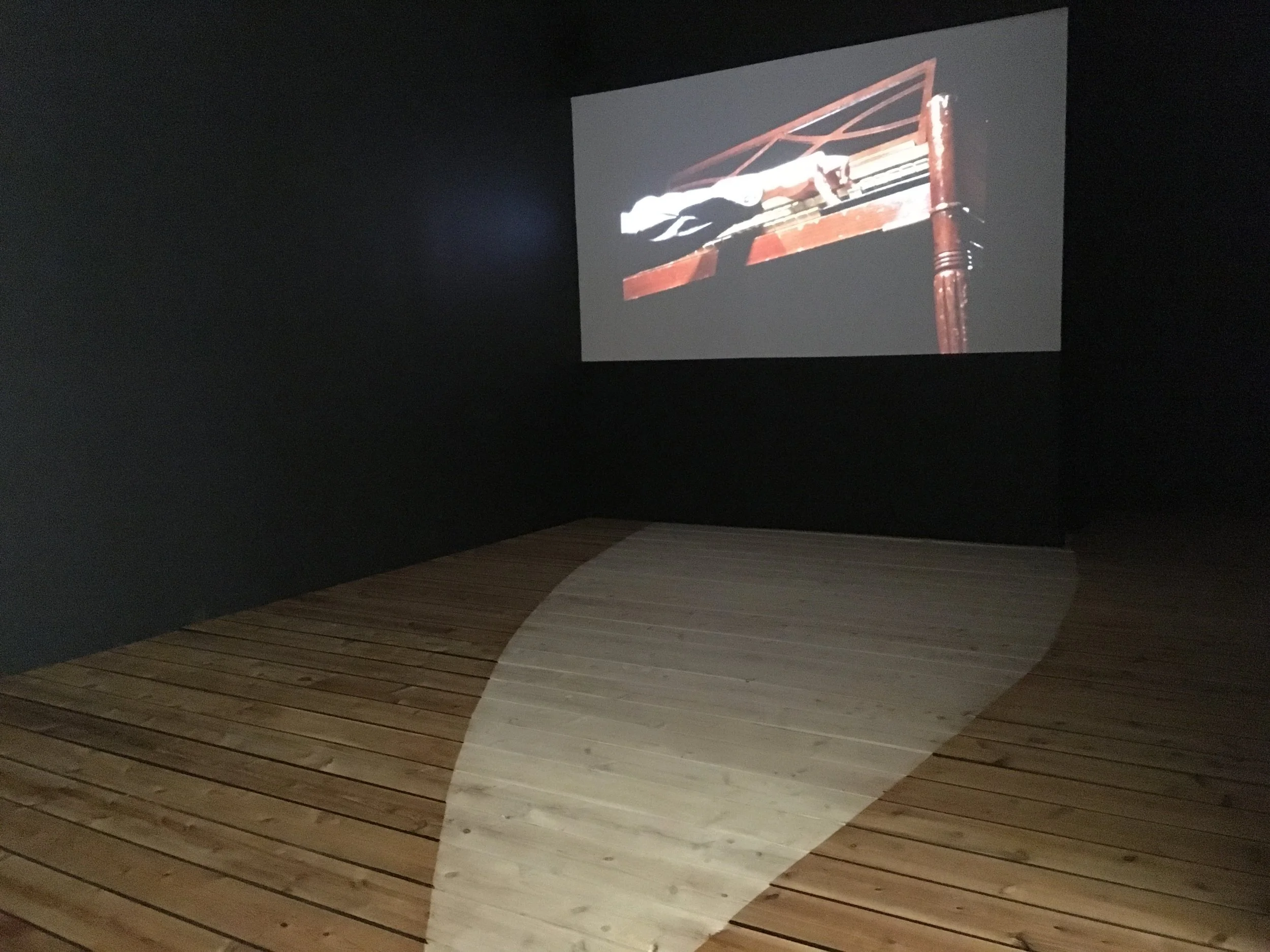 Blood of the Sun, 2016 Installation: 16 mm color film and cedar deck with lime wash Dimensions vary